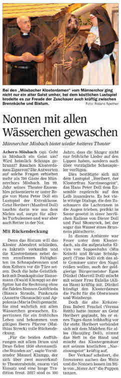 Achern-Mösbach (sp). Geht in Mösbach ein Geist um? Wird heimlich Schnaps gebrannt? Rauchen Klosterdamen Zigarren? Die Antworten auf solche Fragen erhielten mehr als 700 Gäste des Männerchors Mösbach. Im 99. Jahr seines Theater-Ensembles präsentierte er unter Regie von Hans Peter Doll ein Lustspiel der Extraklasse. Geist Heribert (Manfred Doll) tauchte darin wie aus dem Nichts auf, sorgte für allerlei Turbulenzen und war aber auch Retter in der Not.